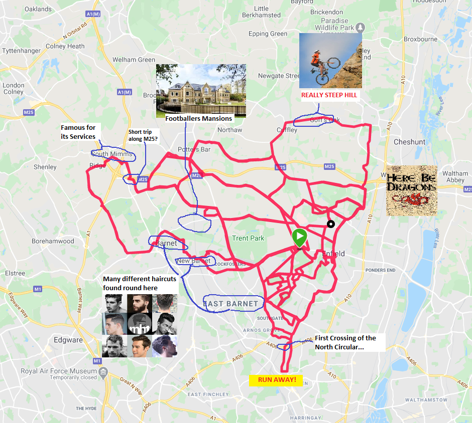 Here's a map of my fully-lockdown-compliant bike rides to date, showing some exciting local landmarks
